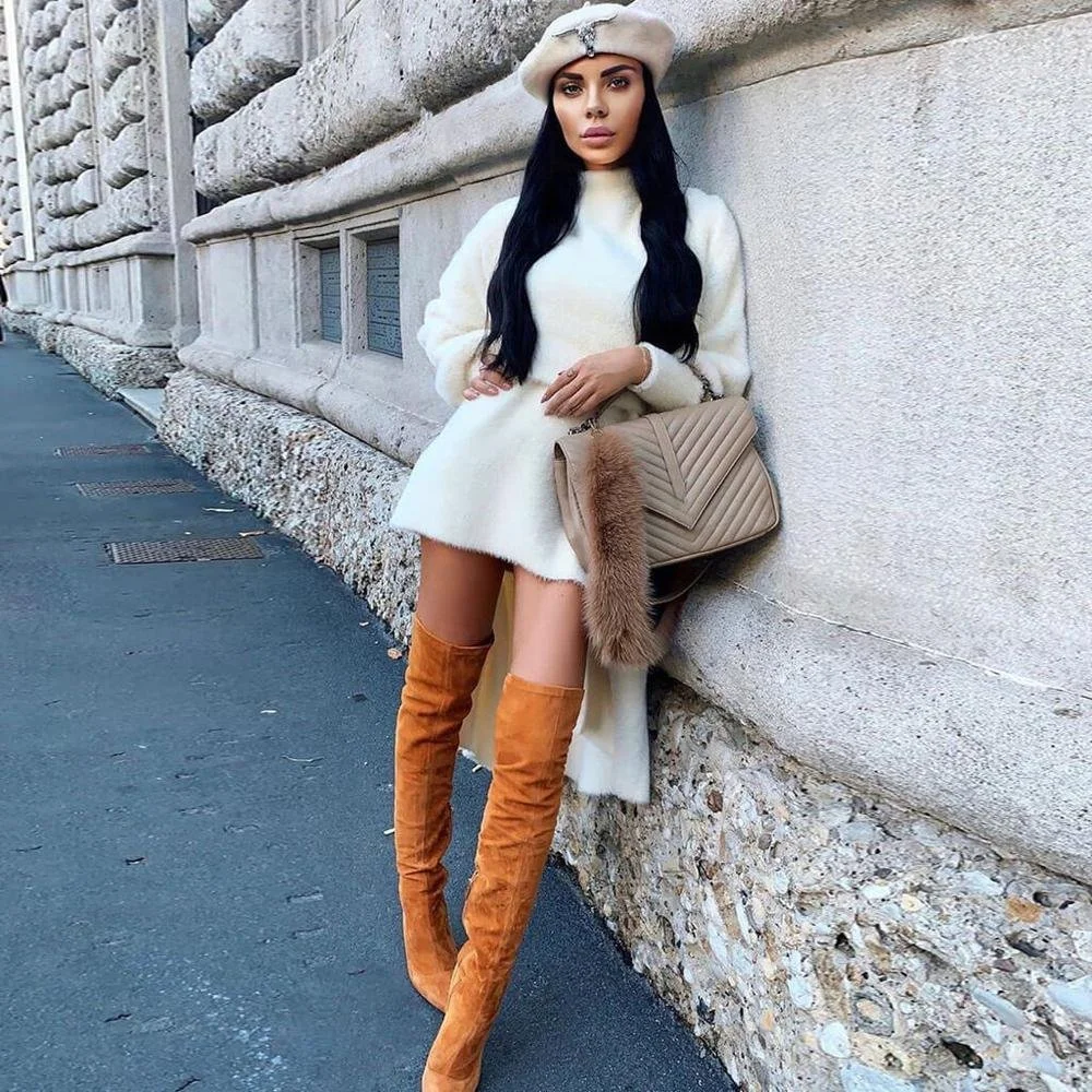 · Wearing with a pair of high waist jean – you can add a thigh high boot to create the appearance of longer legs and a smaller waist. A MUST – The jean should be a skinny jean in order for the boot to seamlessly fit over it with little to no bulk at the ankles.